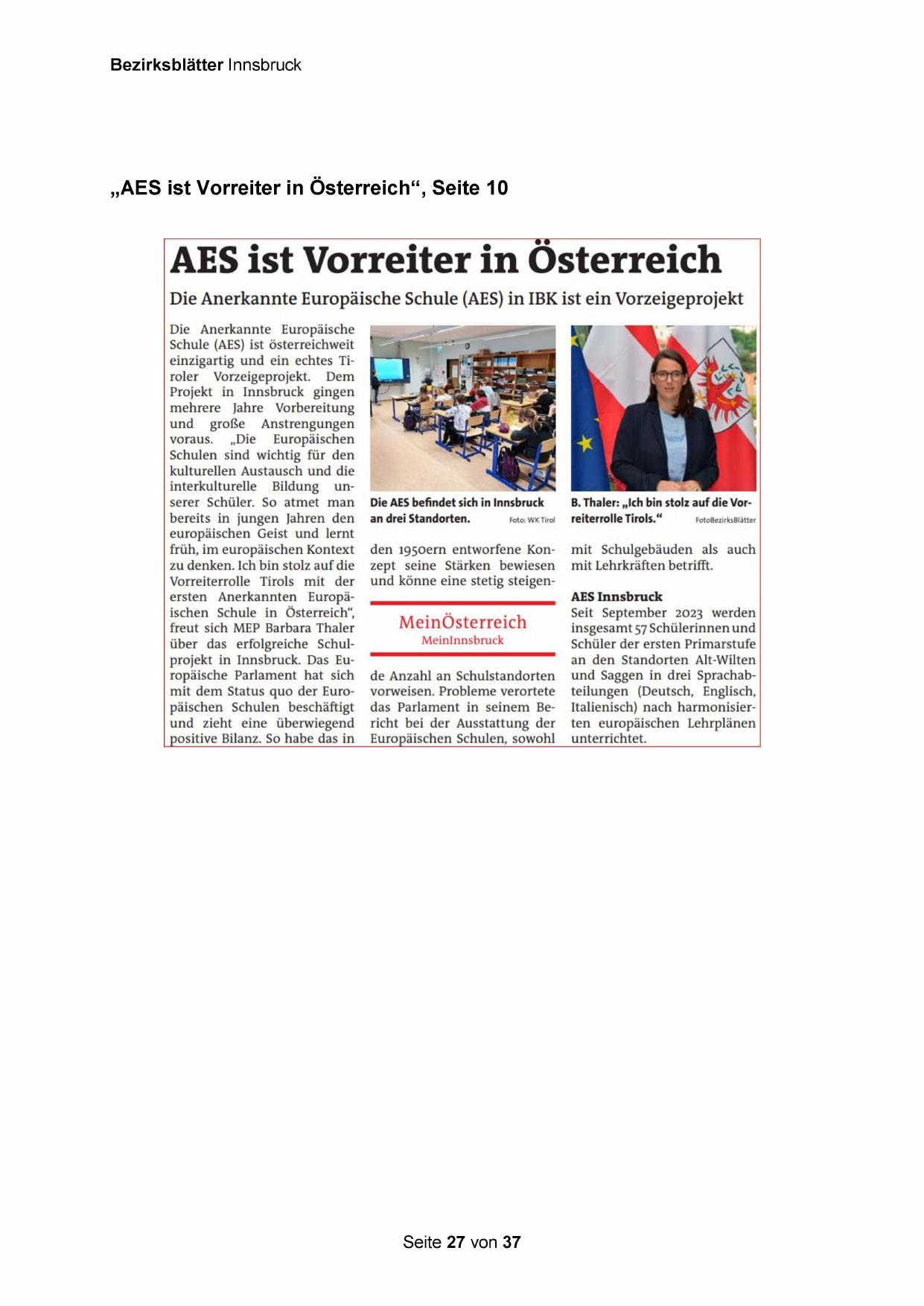 über das erfolgreiche Schulprojekt in Innsbruck. Das Europäische Parlament hat sich