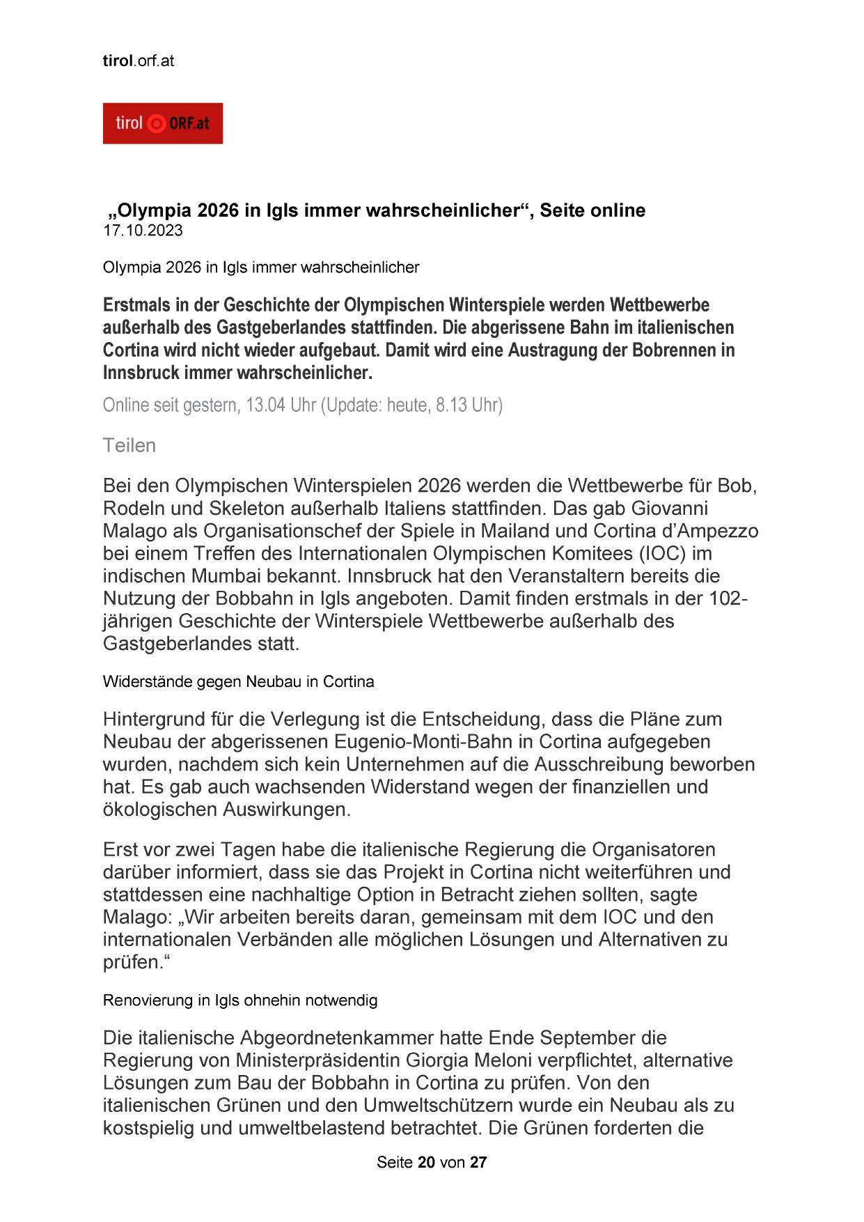 „Olympia 2026 in Igls immer wahrscheinlicher“, Seite online
