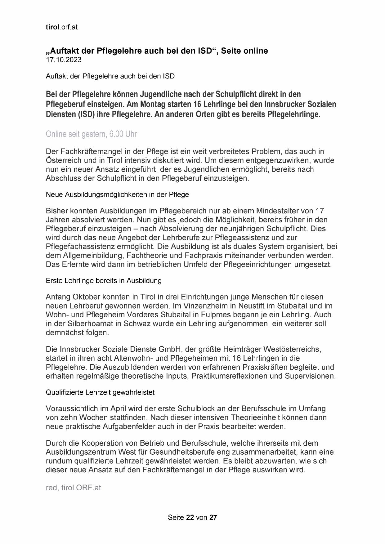 „Auftakt der Pflegelehre auch bei den ISD“, Seite online