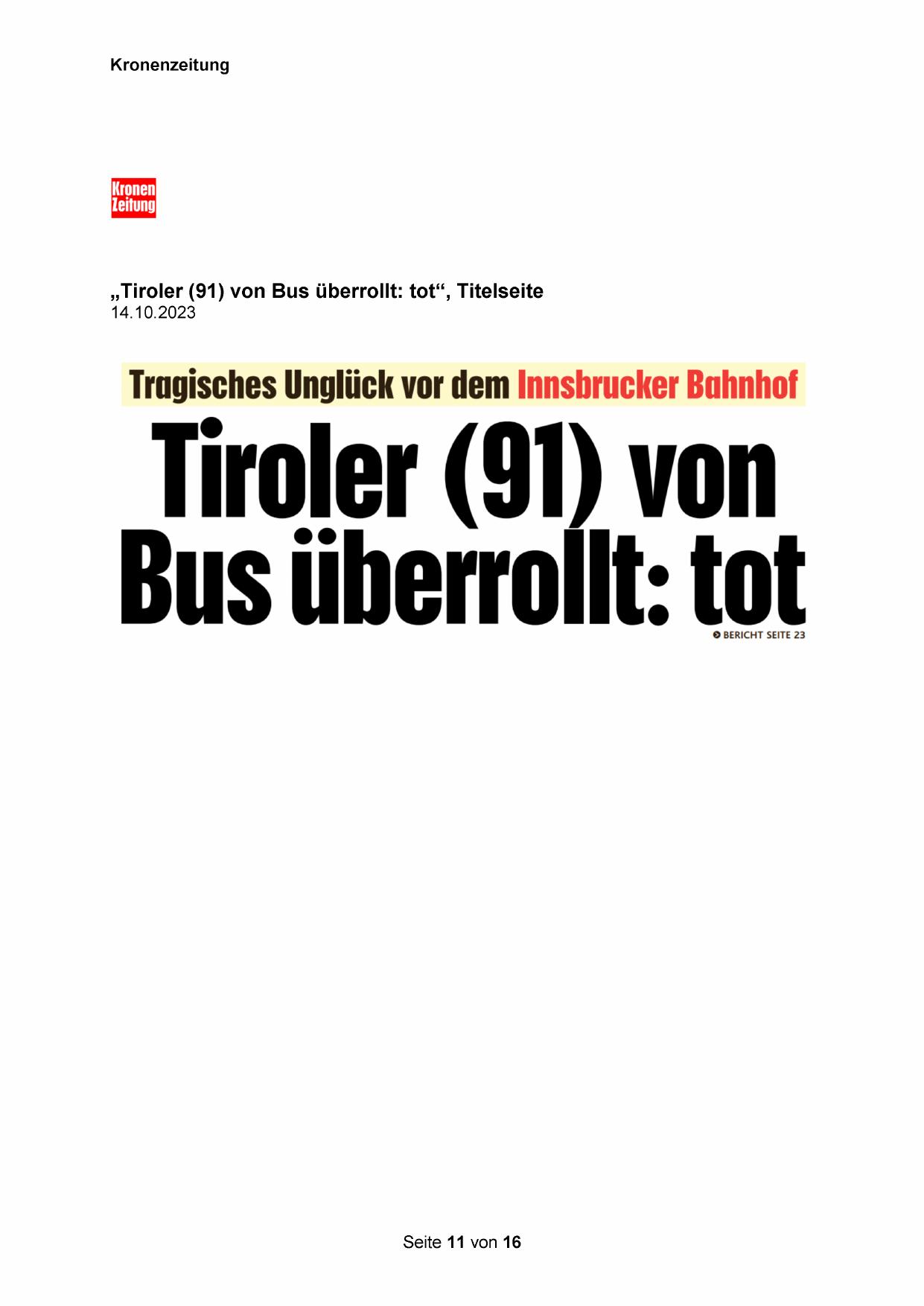 „Tiroler (91) von Bus überrollt: tot‘“, Titelseite