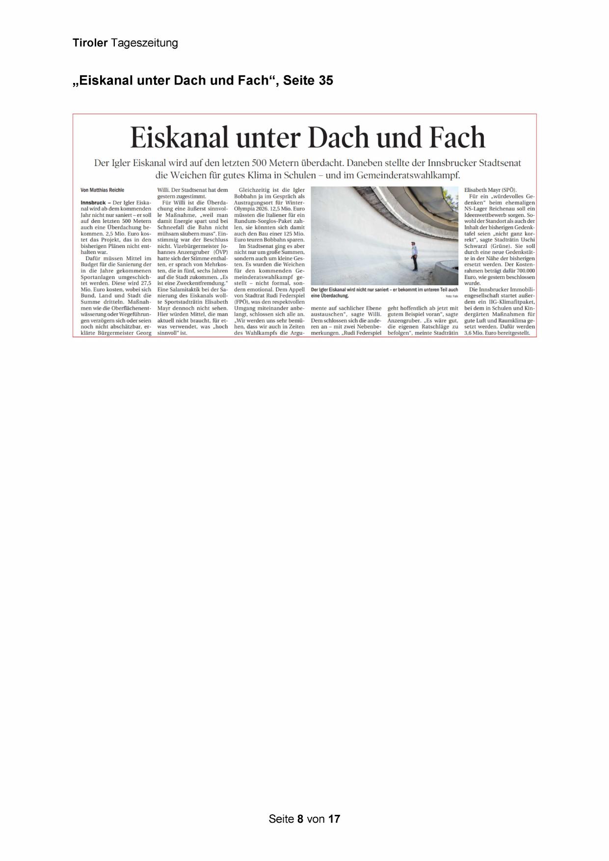 Der Igler Eiskanal wird auf den letzten 500 Metern überdacht. Daneben stellte der Innsbrucker Stadtsenat