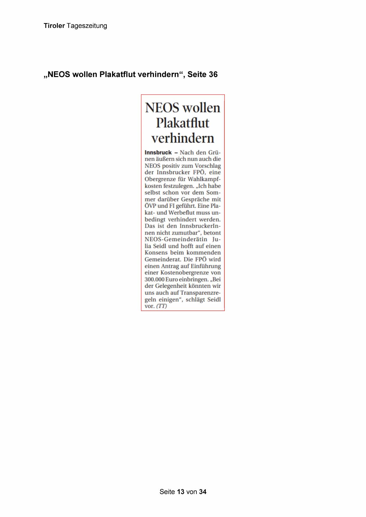 „NEOS wollen Plakatflut verhindern“, Seite 36