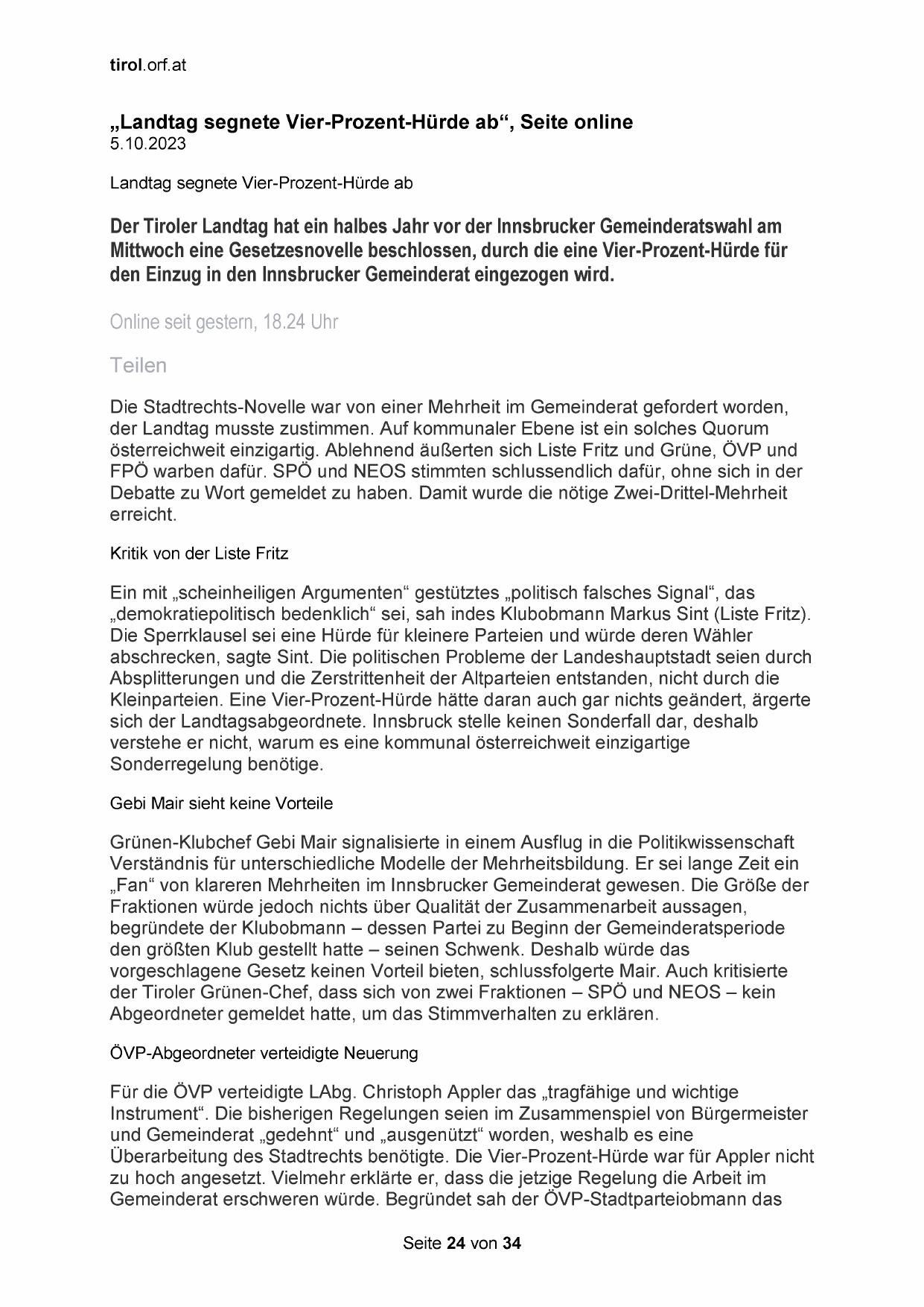 österreichweit einzigartig. Ablehnend äußerten sich Liste Fritz und Grüne, ÖVP und