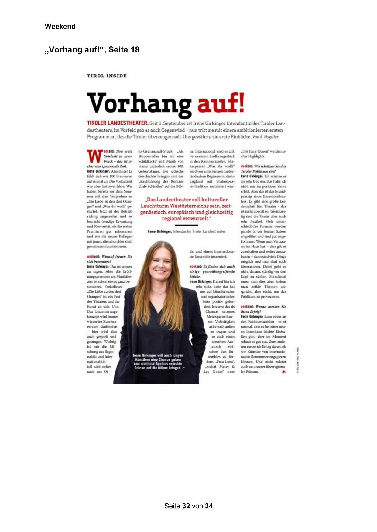 TIROLER LANDESTHEATER. Seit 1. September ist Irene Girkinger Intendantin des Tiroler Landestheaters. Im Vorfeld gab es auch Gegenwind - nun tritt sie mit einem ambitionierten ersten