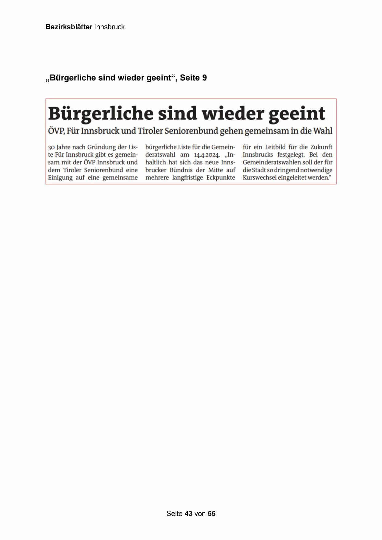 bürgerliche Liste für die Gemeinderatswahl am 14.4.2024. „Inhaltlich hat sich das neue Innsbrucker Bündnis der Mitte auf