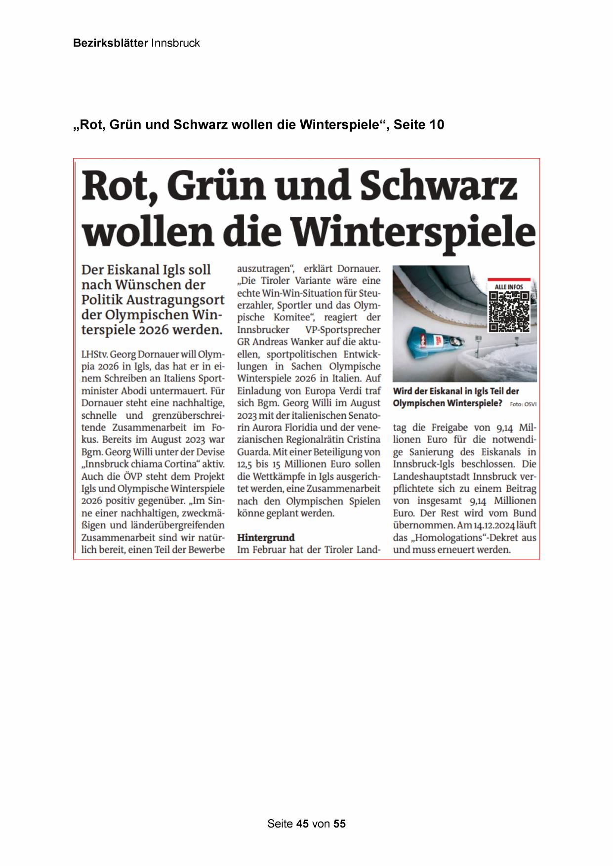LHStv. Georg Dornauer will Olympia 2026 in Igls, das hat er in einem Schreiben an Italiens Sportminister Abodi untermauert. Für