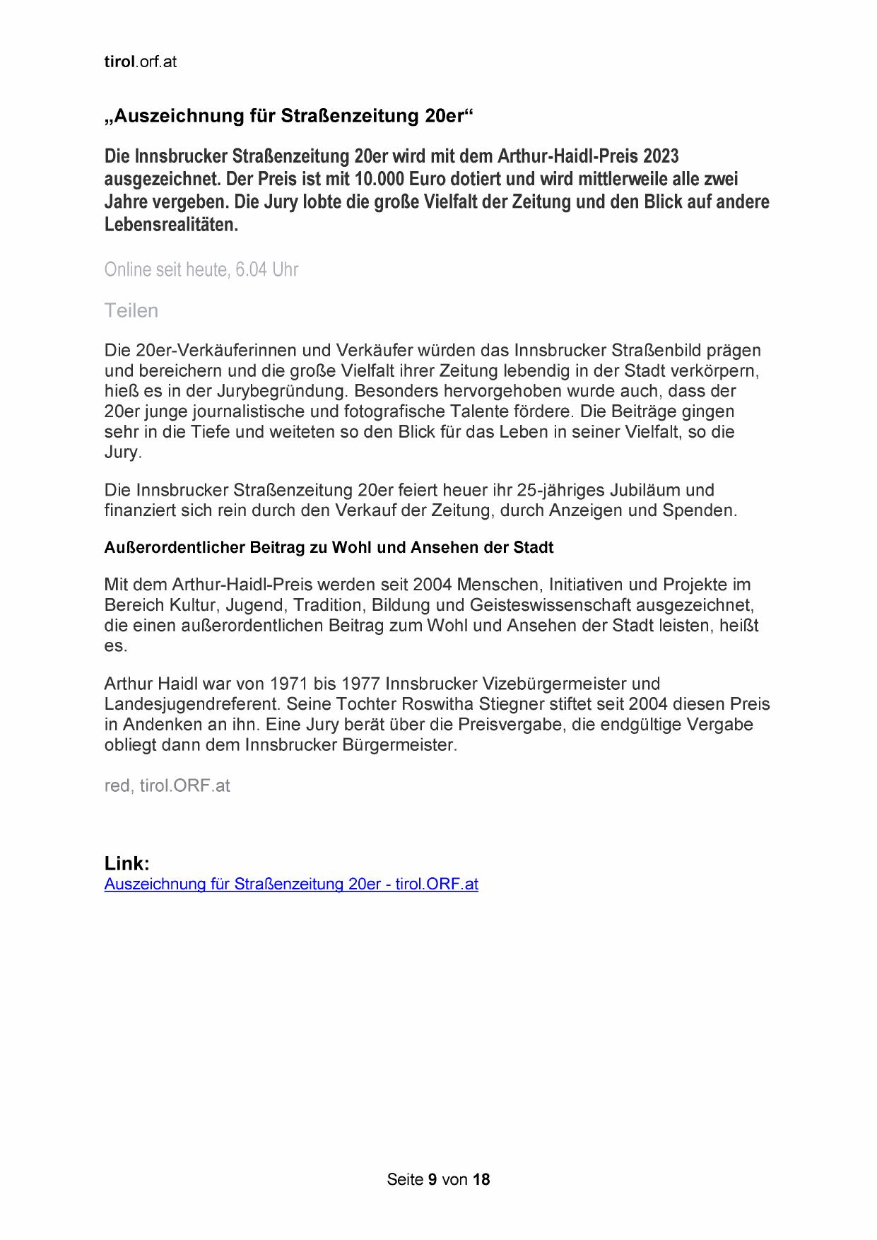 Die Innsbrucker Straßenzeitung 20er wird mit dem Arthur-Haidl-Preis 2023