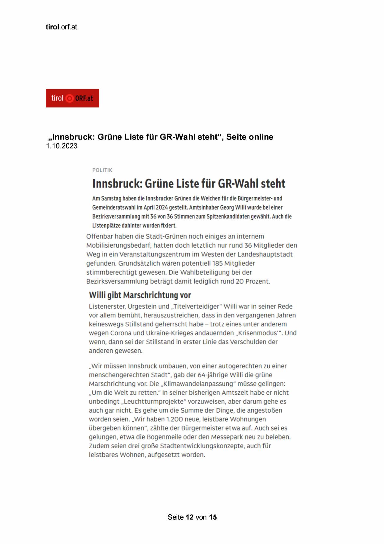 „Innsbruck: Grüne Liste für GR-Wahl steht“, Seite online