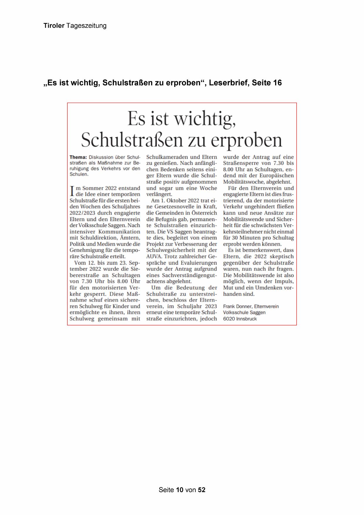 „Es ist wichtig, Schulstraßen zu erproben“, Leserbrief, Seite 16