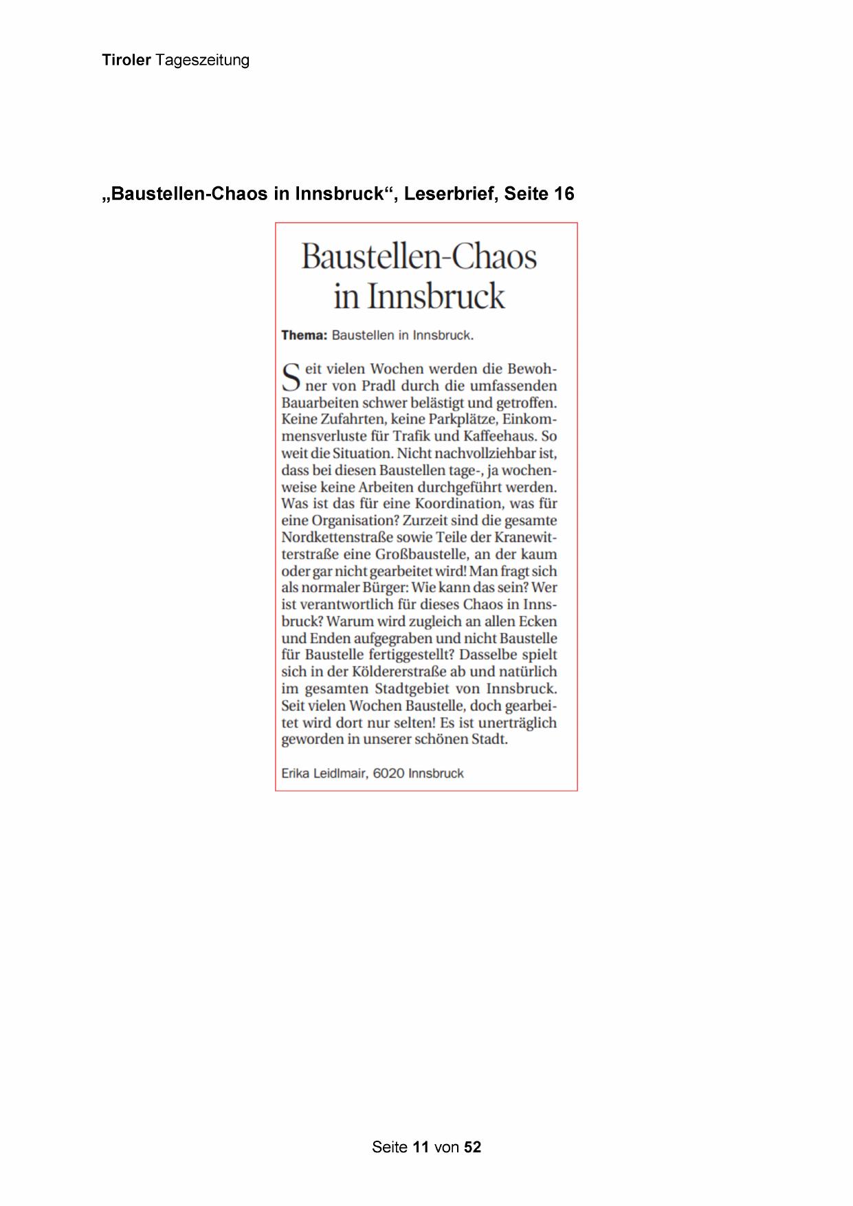 „Baustellen-Chaos in Innsbruck“, Leserbrief, Seite 16