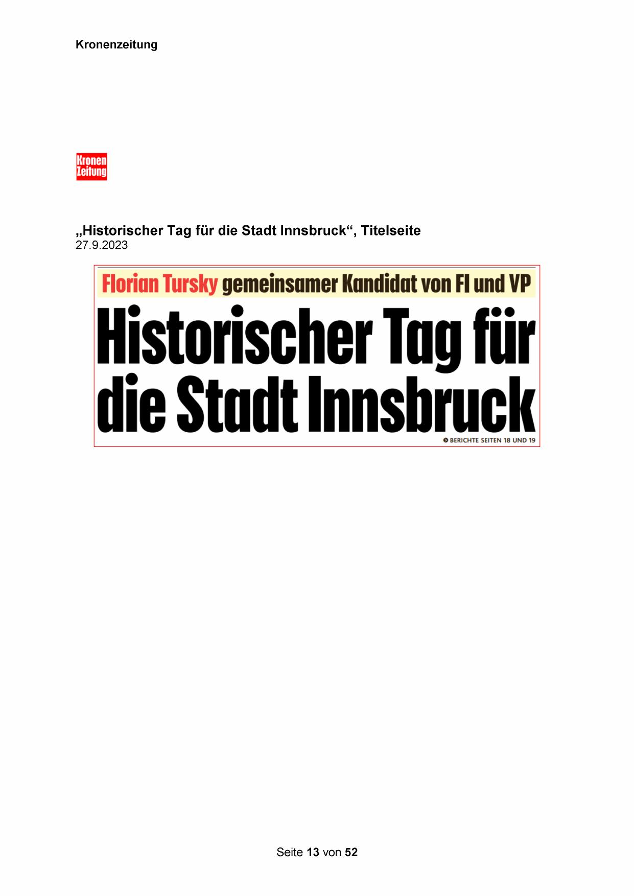„Historischer Tag für die Stadt Innsbruck“, Titelseite